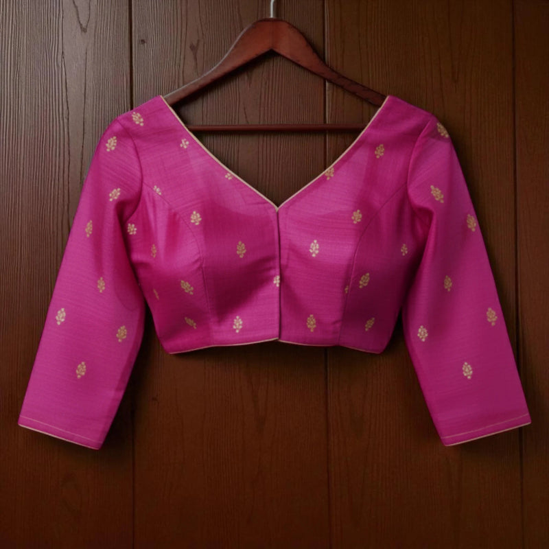 - Soft blush pink base with woven zari motifs