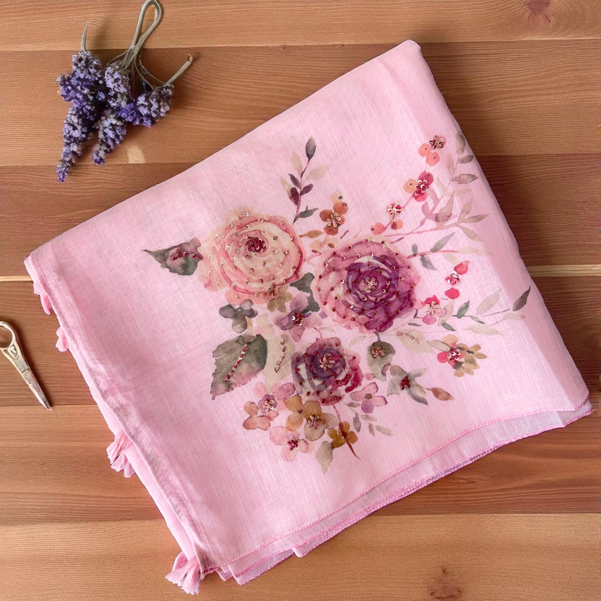 This blush pink linen saree is a picture of softness and elegance, designed for women who love understated charm. Its lightweight texture makes it perfect for day-long comfort, while the delicate hand embroidery on hand painted floral prints adds just the right touch of grace and sophistication. A versatile drape for brunches, cultural events, casual celebrations, or serene evening outings.