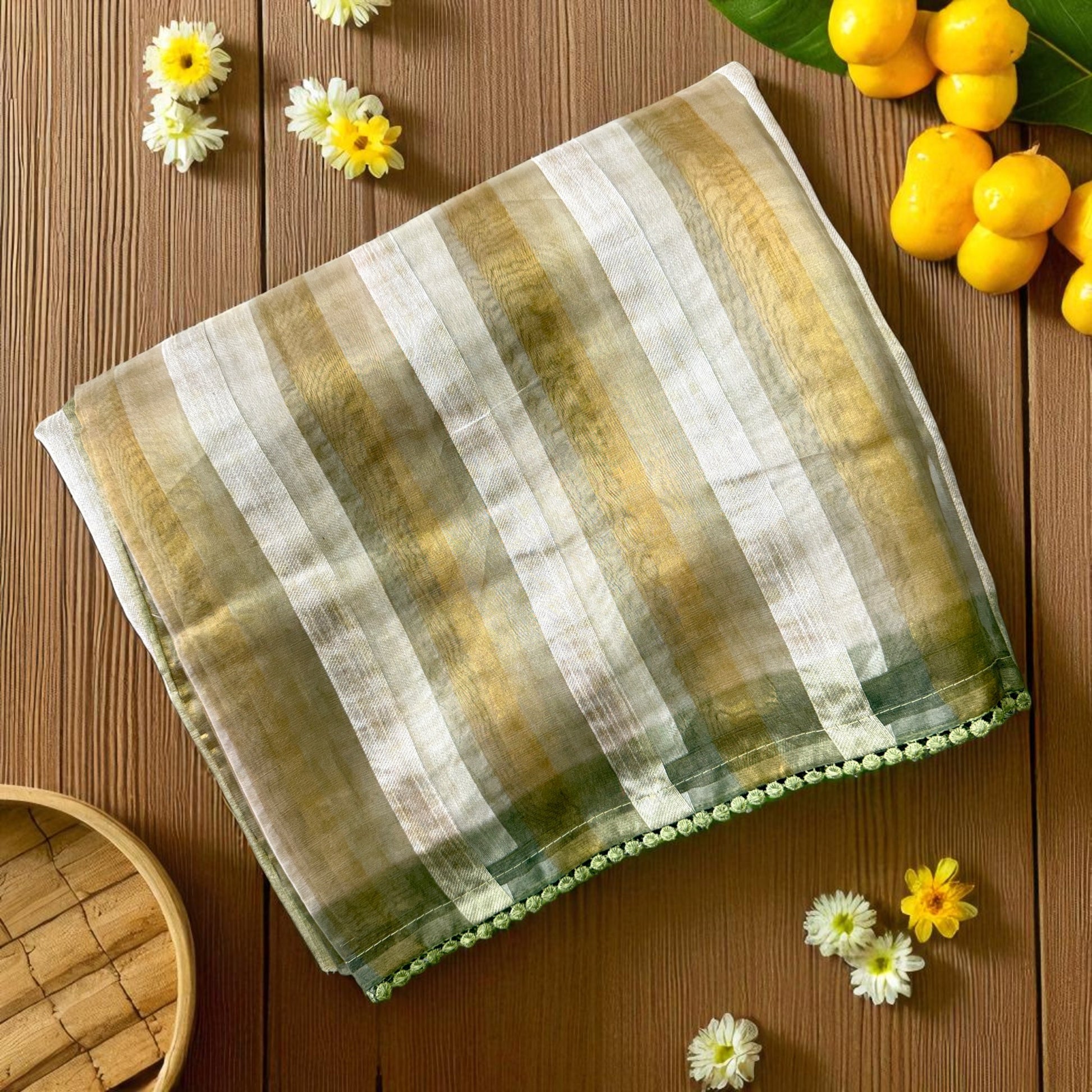 A soft and graceful organza saree in pistachio green with subtle Gold and silver stripes, designed for effortless elegance. Paired with a hand-embroidered floral blouse in pastel tones, it blends timeless charm with modern sophistication. Perfect for brunches, festive gatherings, and elegant daytime occasions.