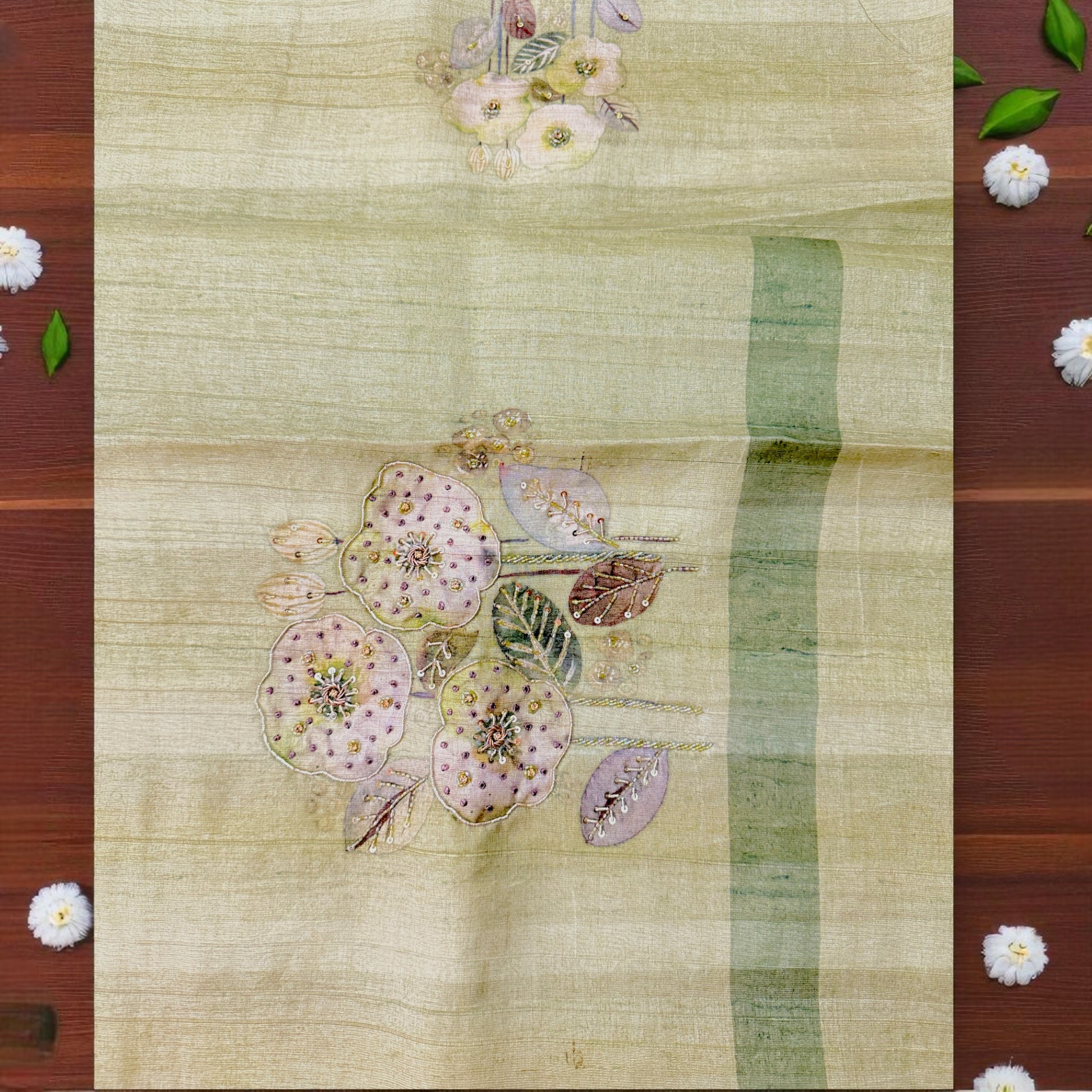 - Hand-embroidered floral blouse in pastel shades