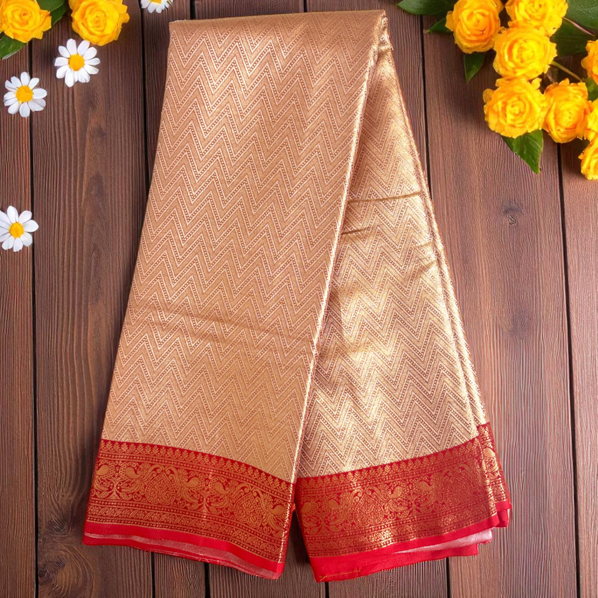 “Elegant golden Tissue saree with chevron weave, rich red zari border, and intricate paisley pallu – perfect for weddings and festive celebrations. Paired with a matching Patola inspired woven blouse for a timeless traditional look.”