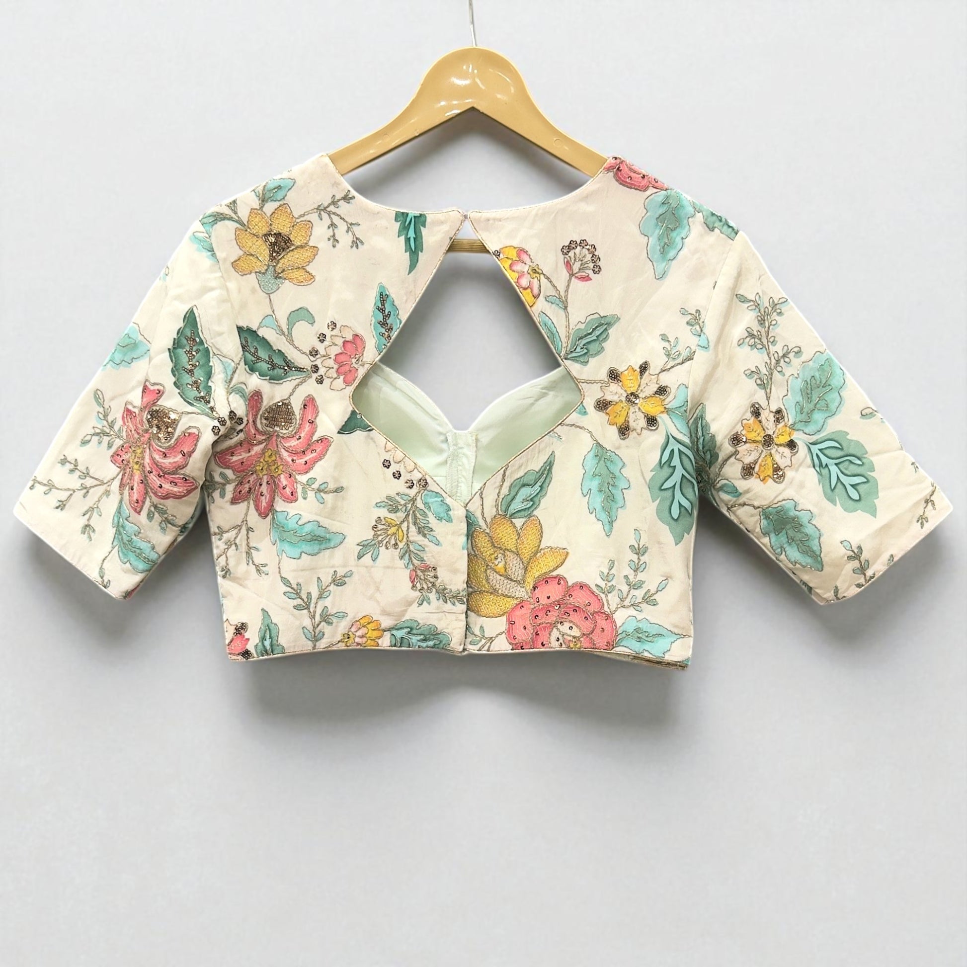 - Blouse Fabric: Crepe with floral embroidery