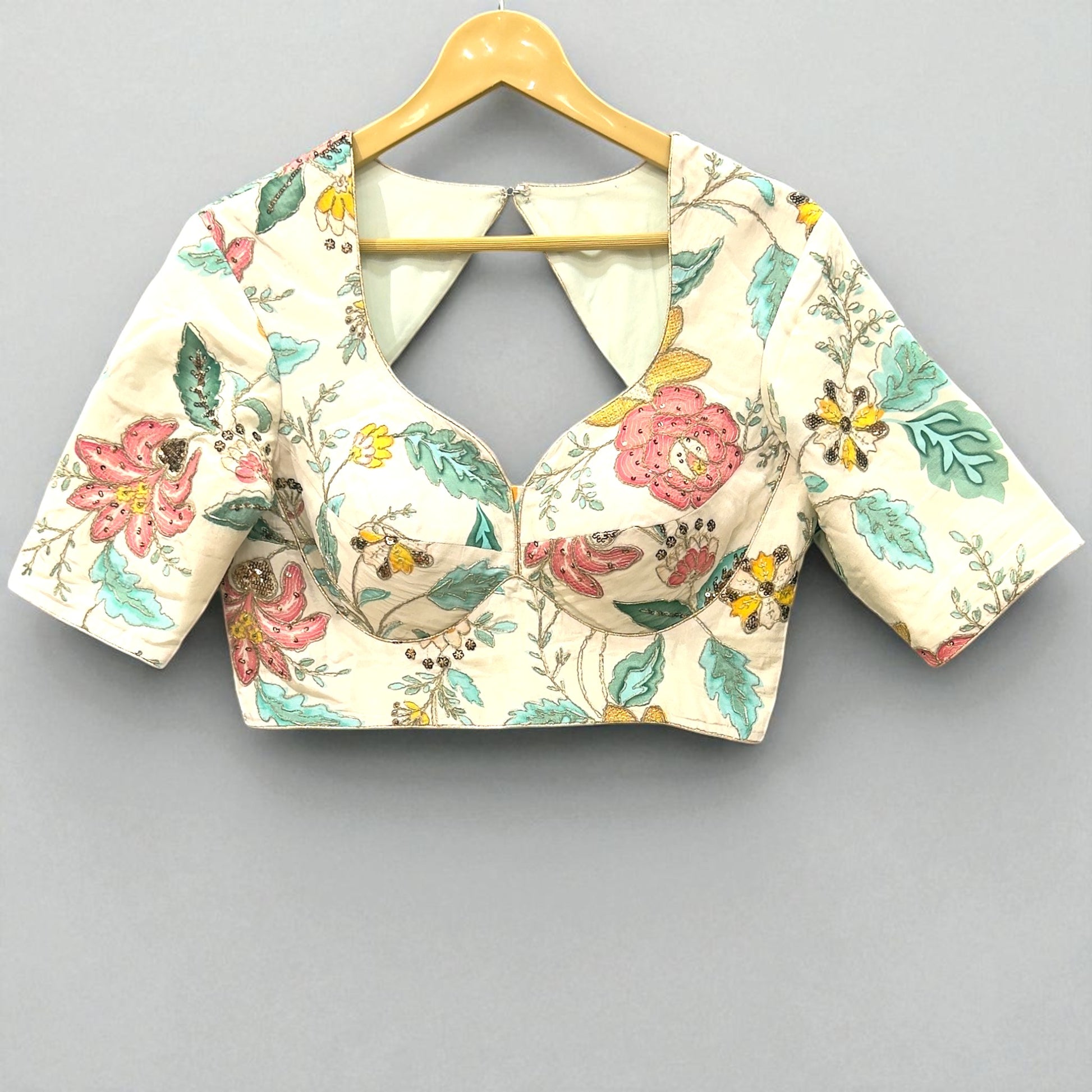 - Blouse Style: Hearst shaped-neck, padded cups, half sleeves, back keyhole with hook closure