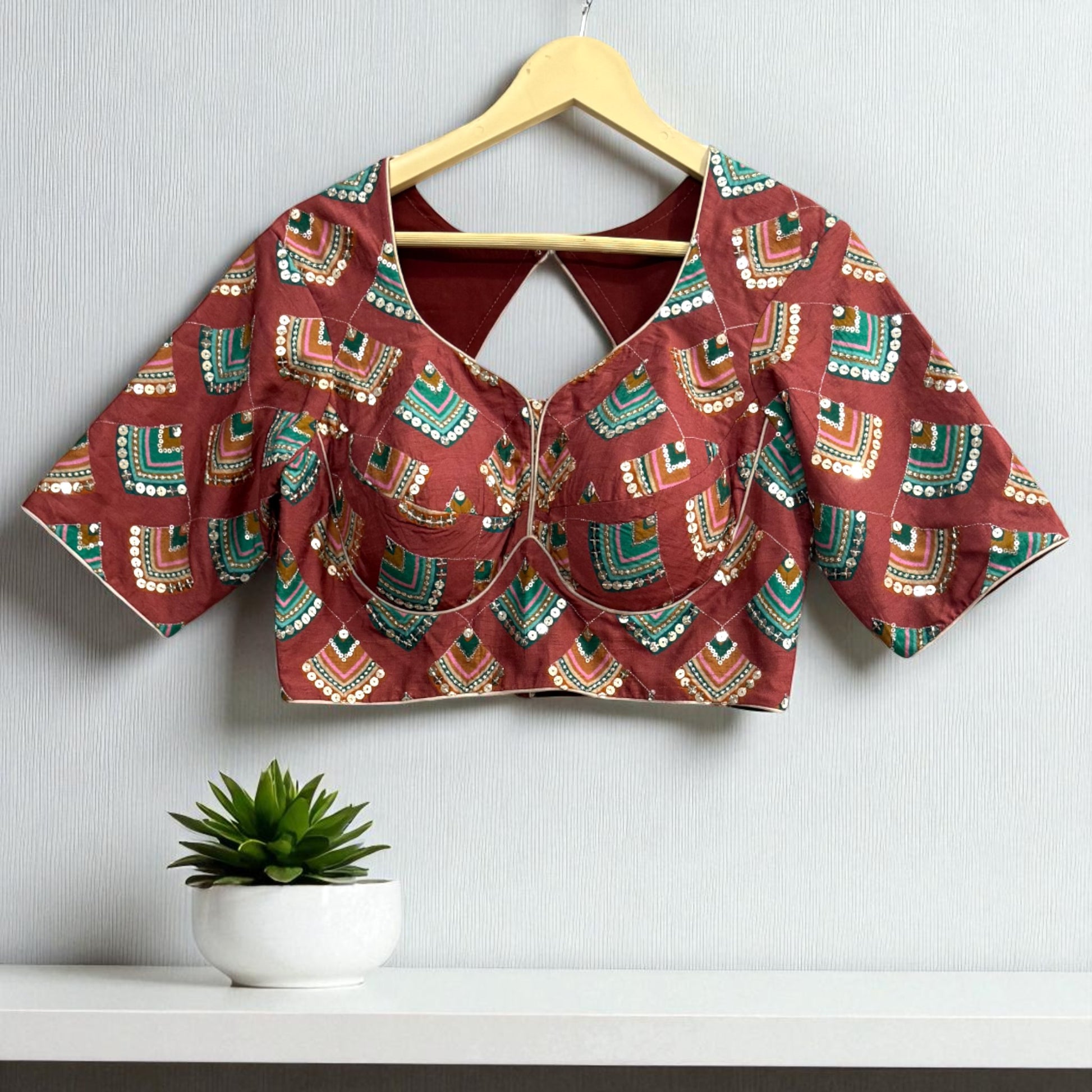 - Blouse Fabric: Geometric sequin design on rich maroon base
